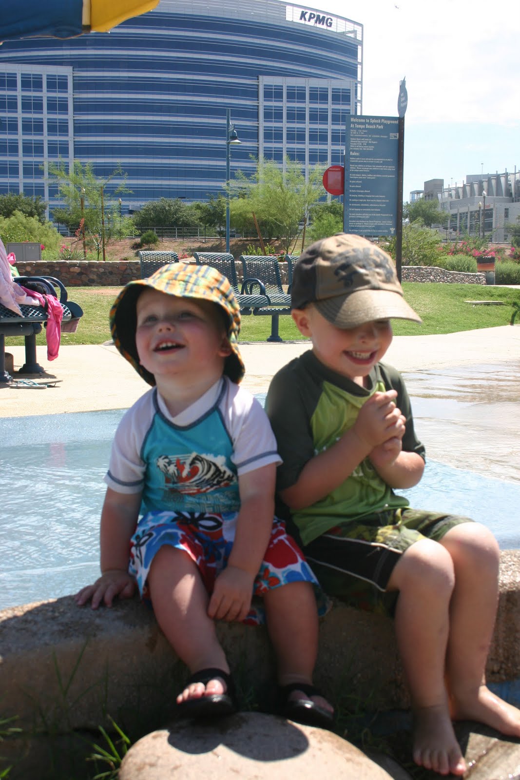 On Tuesday, our last morning in Gilbert, we drove to the splash park at Tempe Beach near ASU. We got there before the water turned on so we had to take the kids on a super hot walk. They were pretty crabby by the time we got back to the park but the cool water was a great remedy.